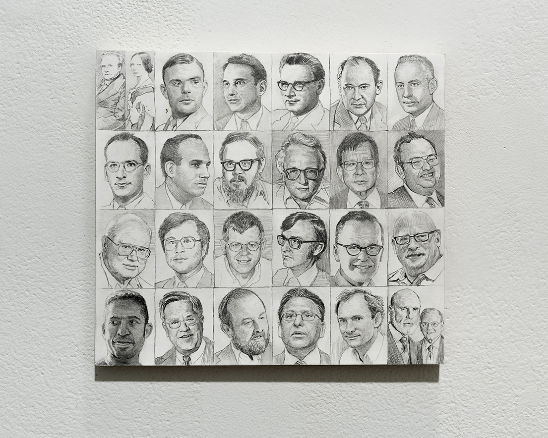 Note: Persons depicted, start top left: Charles Babbage and Ada Lovelace, Alan Turing, John V. Atanasoff, Konrad Zuse, John von Neumann, Nathaniel Rochester, John W. Mauchly, J.Presper Eckert, Dennis Ritchie, Chuck Peddle, André Truong Trong Thi, Henry Edward "Ed" Roberts, Dick Morley, Masatoshi Shima, Jon Bosak, Marcian Hoff, John Backus, Alan Cooper, Alan Emtage, Vic Hayes, Charles Goldfarb, Vinod Dham, Tim Berners-Lee, Vince Cerf, and Bob Kahn. |