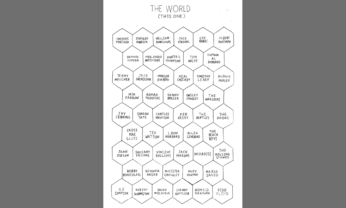 6 drawings (left to right), Wall of Sound, Owsley, Tate, Manson, Kesey, Hell's Angels, custom drawing panels, Arches on Apple-ply, 14" x 10" ea.
